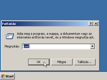 A megjelenő Futtatás párbeszédablakba gépeljük be a cmd karaktersort, majd nyomjuk meg az OK gombot!